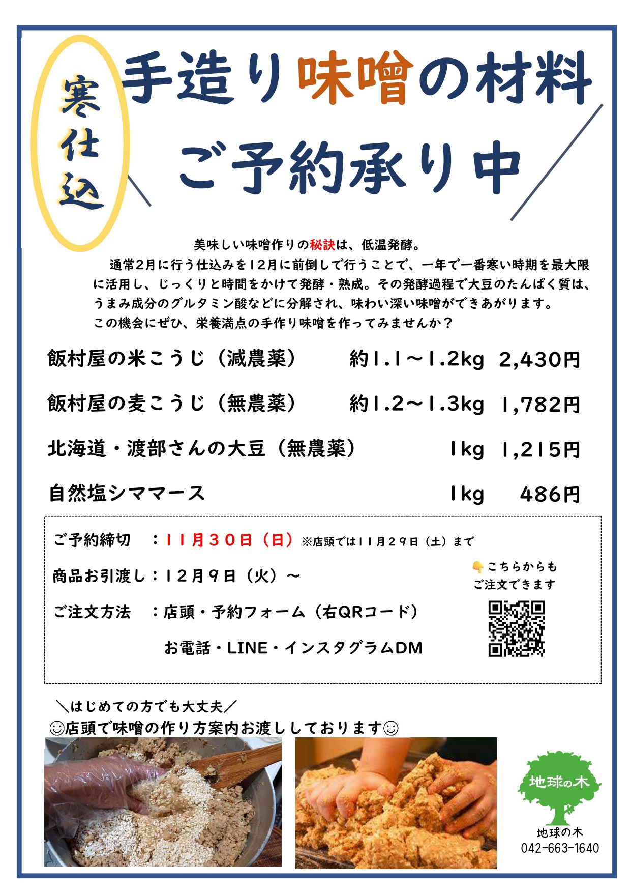 味噌作り材料のご予約開始します♪ 2025.11.8 お知らせ 今年も味噌づくりの季節がやってきました♪ お申し込みはこちらからどうぞ👇 https://forms.gle/LwFxYma45TrpdaqV9 お知らせ 米粉パンの取り扱い始めました(^^♪前の記事 賞味期限近し!最大4割引セールのご案内(11月)次の記事