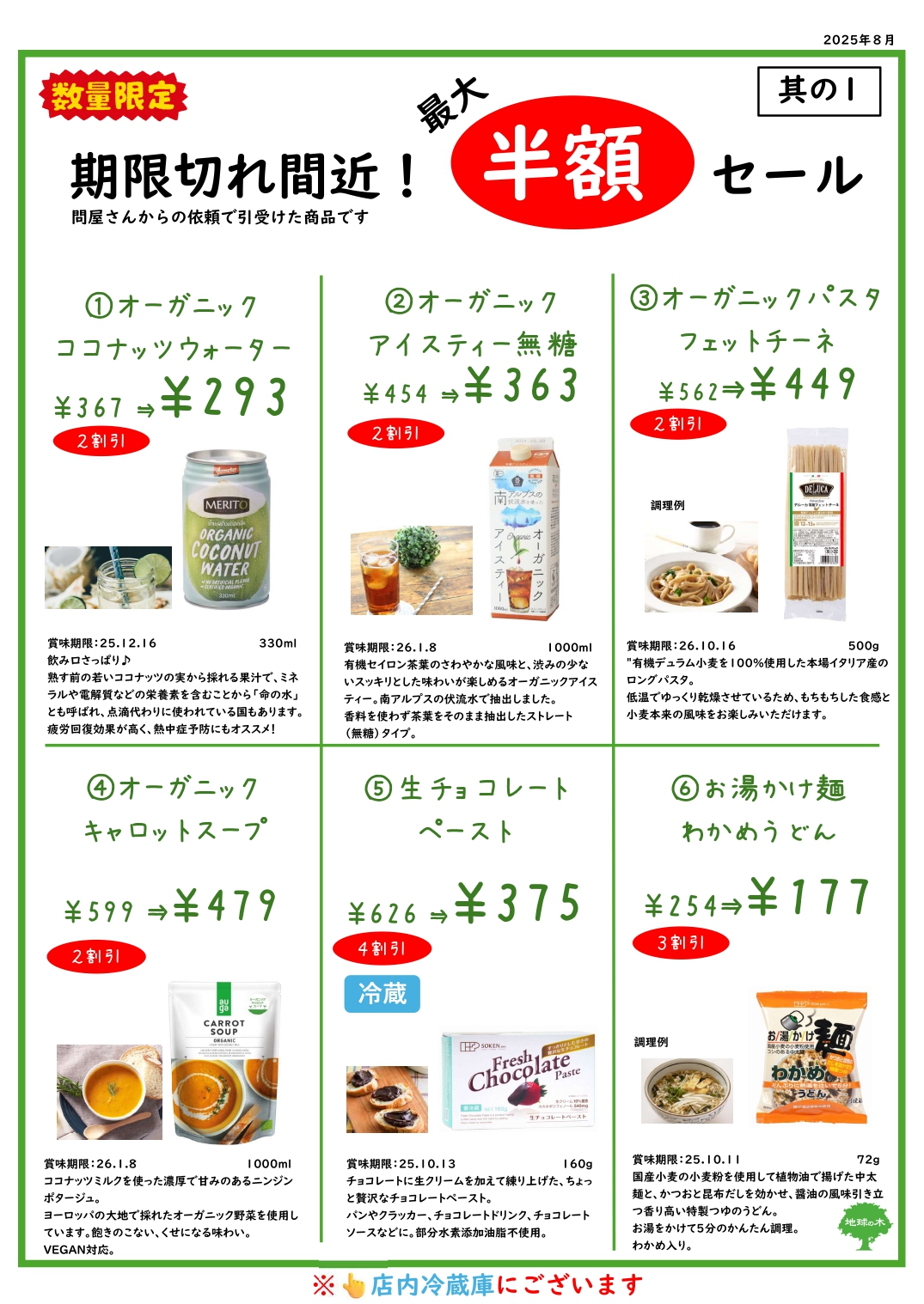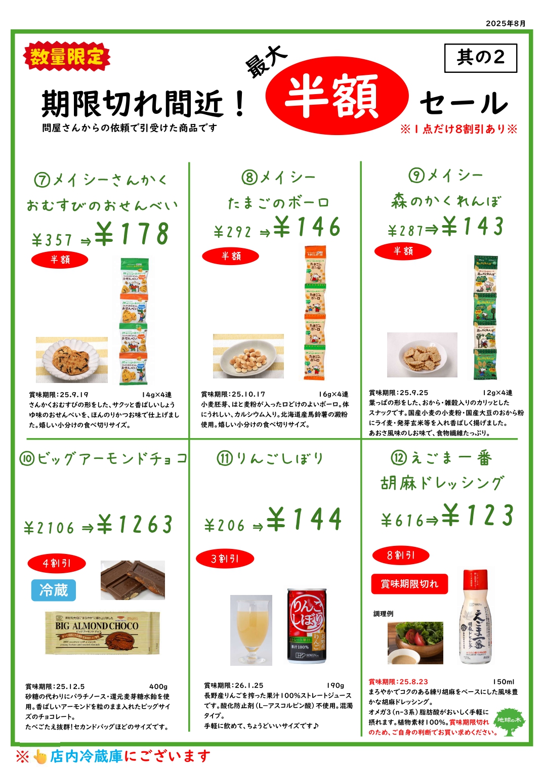 最大半額セールのお知らせ(8月)🌻 2025.08.25 セール情報 いずれも 賞味期限近いものあり 数量限定 取り置き不可 パッケージに傷などある可能性有 1つだけ8割引(賞味期限切れ)ありますm(__)m セール情報 今が旬!いちじくご予約受付中♬前の記事 新米入荷しました!!次の記事