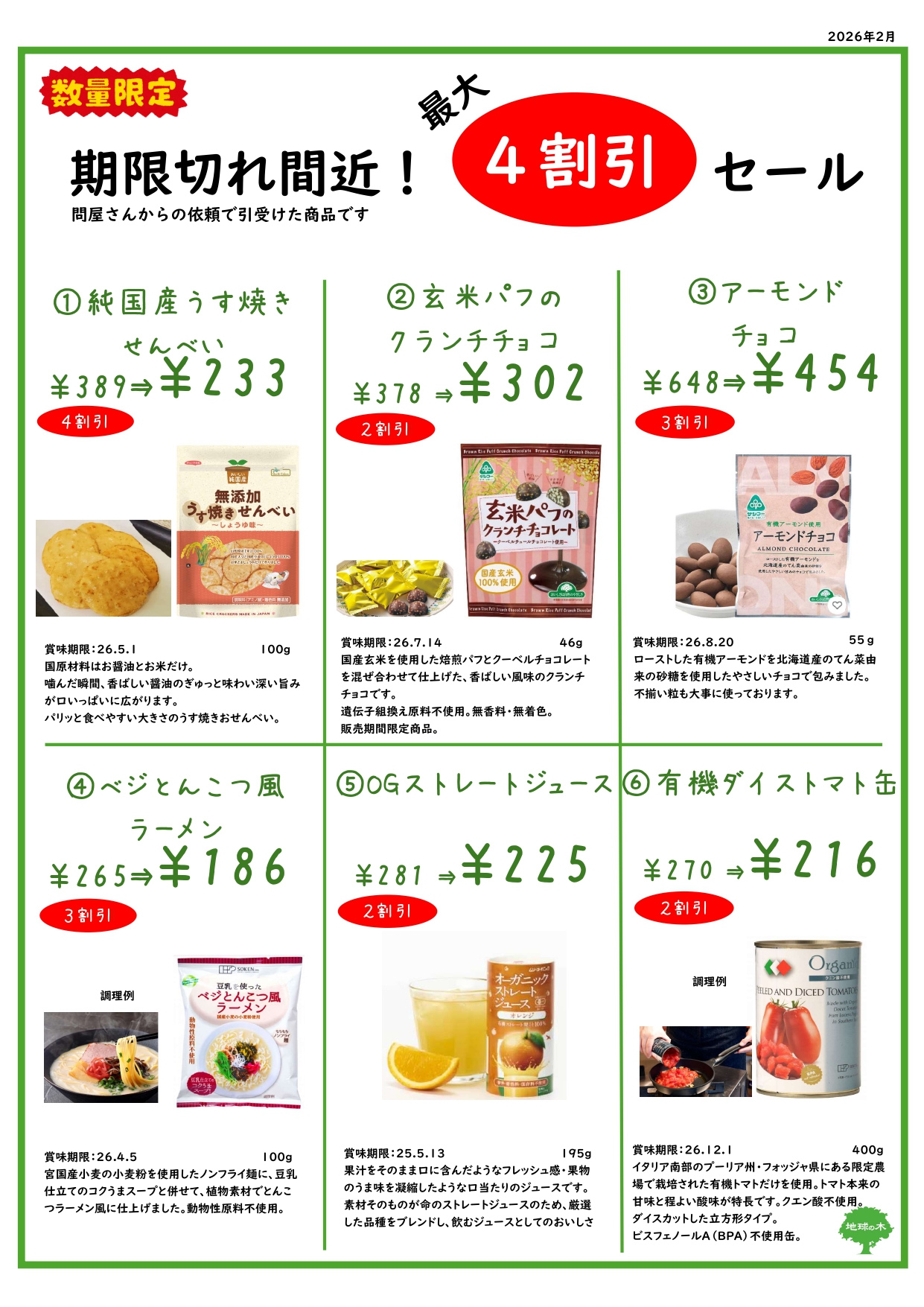 賞味期限近し!最大4割引セールのご案内(2月) 2026.02.14 お知らせ, セール情報 いずれも 賞味期限近いものあり 数量限定 取り置き不可 m(__)m お知らせ, セール情報 賞味期限近し!最大4割引セールのご案内(1月)前の記事 店舗スタッフ募集!!(遅番)次の記事