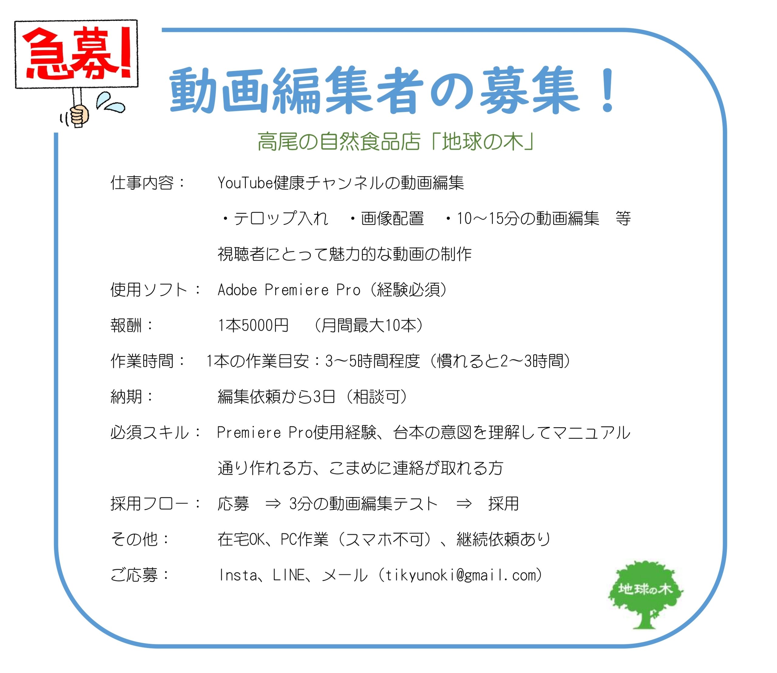 「地球の木」が運営する健康系youtubeチャンネルの「動画編集者」募集です!